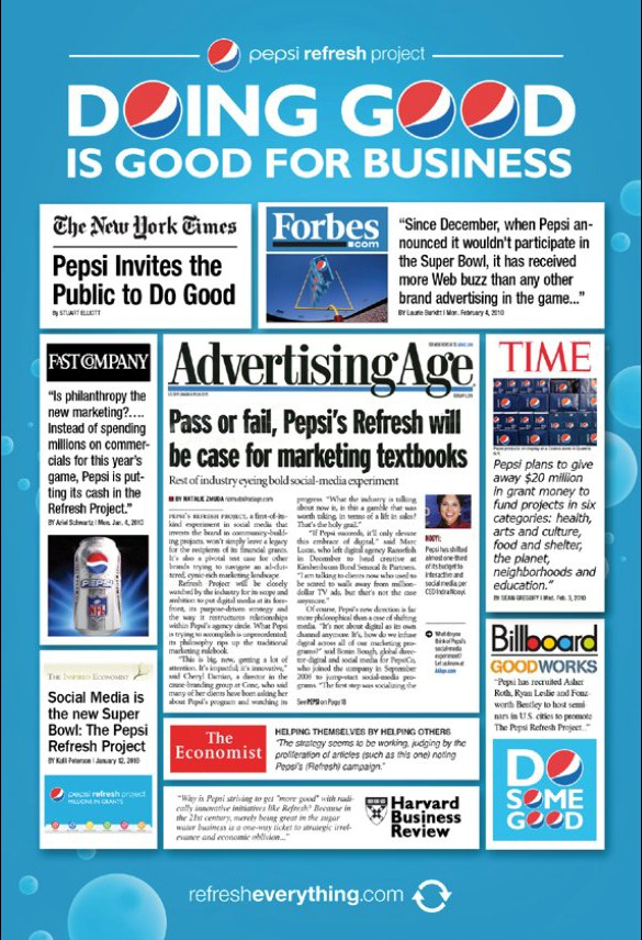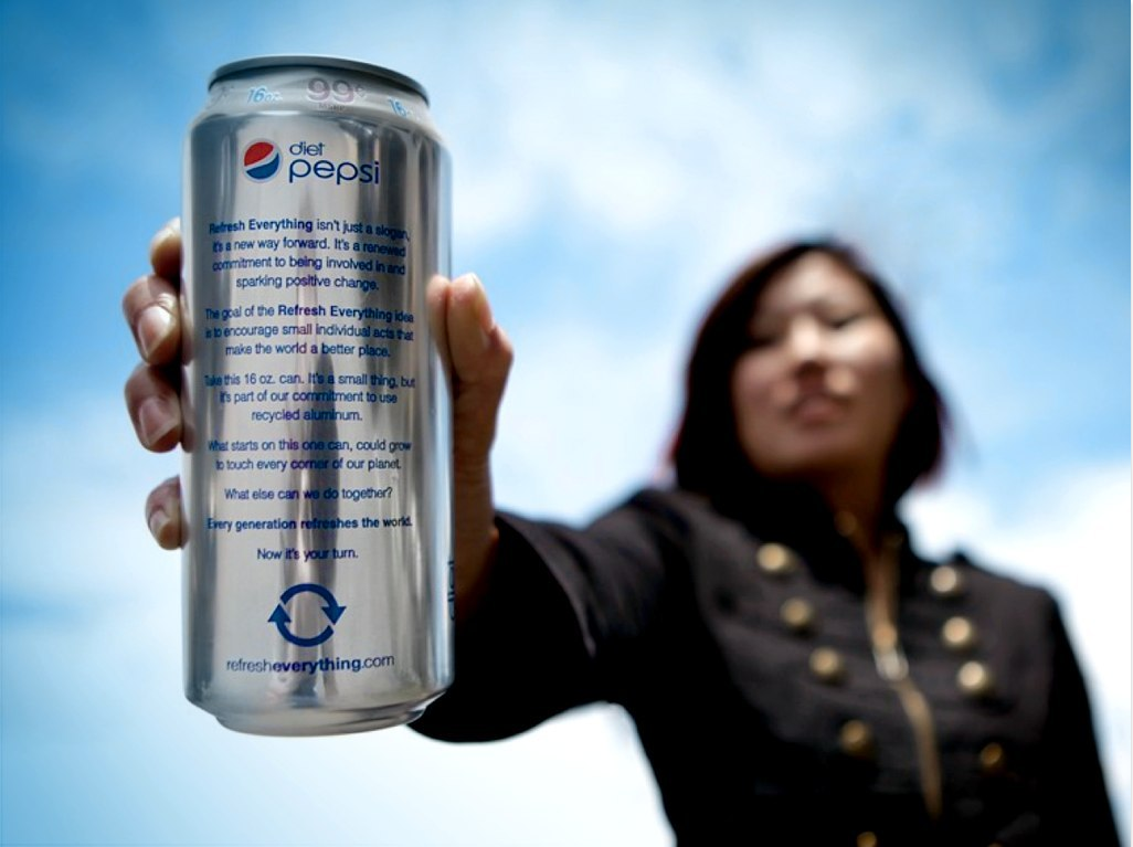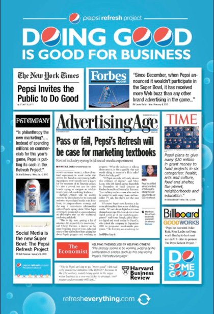 In 2010, Pepsi Refresh Project informed every last piece of media Pepsi put into the world. From traditional media, right down to the actual cans and packaging.